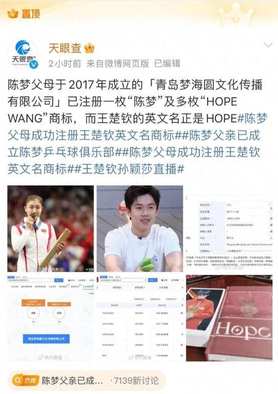先是网友扒出陈妈妈开的公司,注册的一个商标刚好和王楚钦的英文名重合。